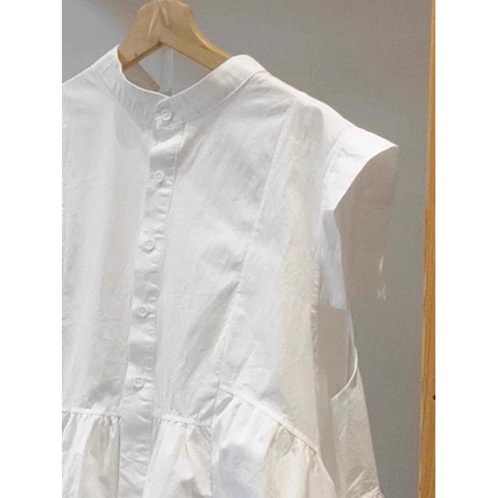 推薦!巨好看~白色小飛袖立領襯衫女夏慵懶風獨特無袖小個子上衣