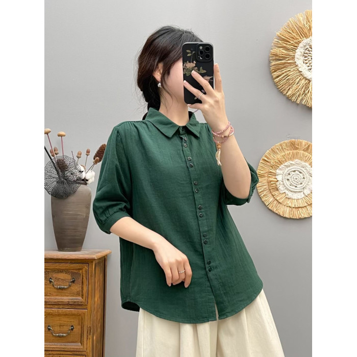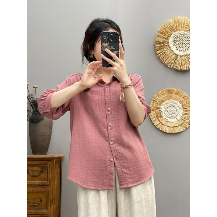夏季薄款純棉雙層棉紗短袖襯衫女方領休閒五分袖上衣百搭純色襯衣