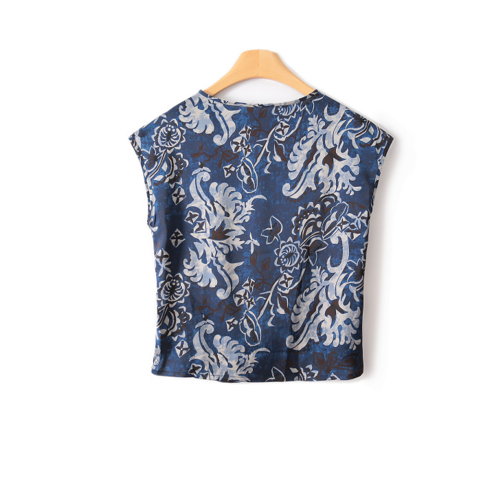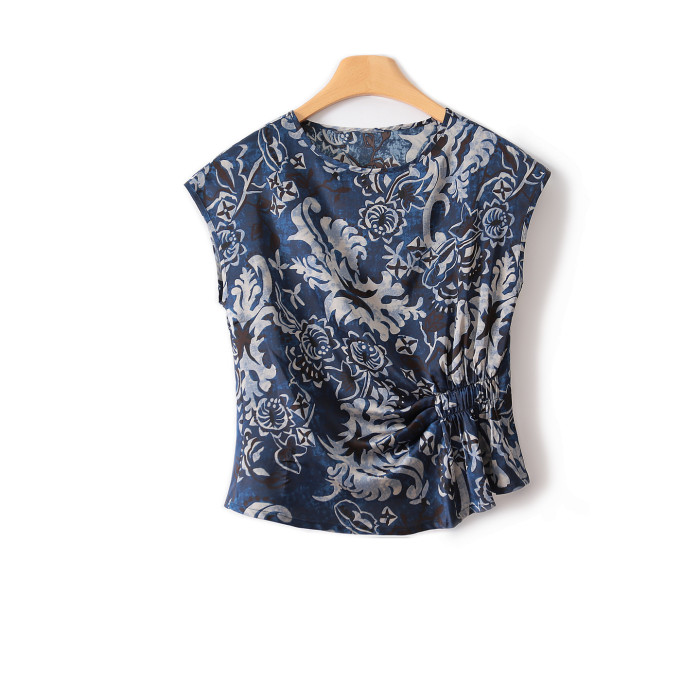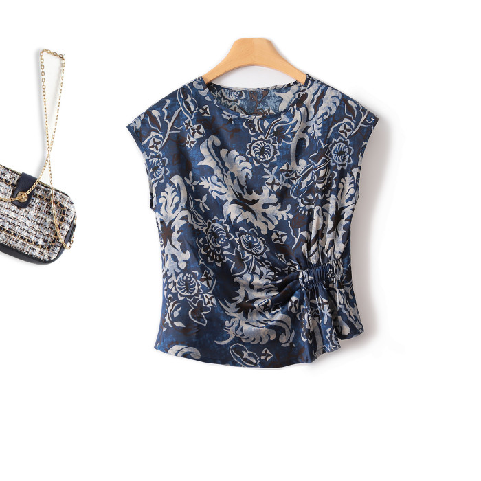 新中式洋氣小衫女2025夏季短袖側邊捏褶青花瓷印花襯衫雪紡衫