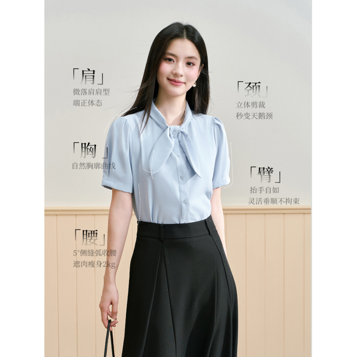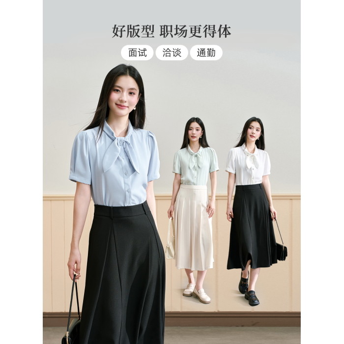 綠色蝴蝶結飄帶短袖襯衫女夏款雪紡教資襯衣面試穿搭套裝職業正裝
