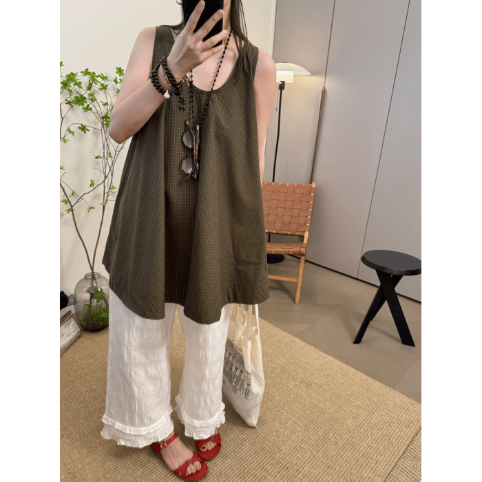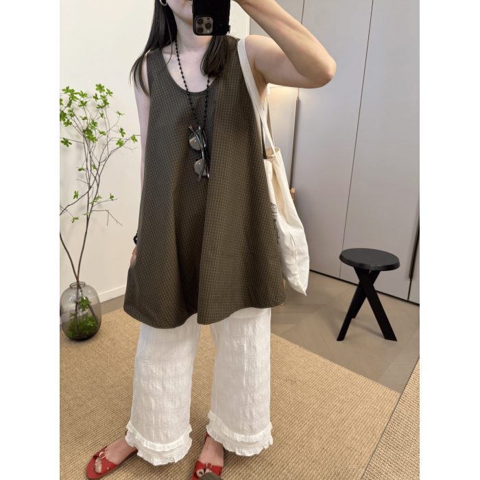 MKDesign 夏季新品進口格紋全棉立體剪裁顯瘦背心娃娃襯衫上衣