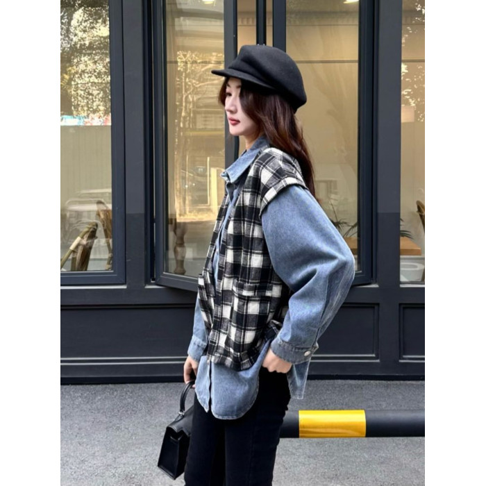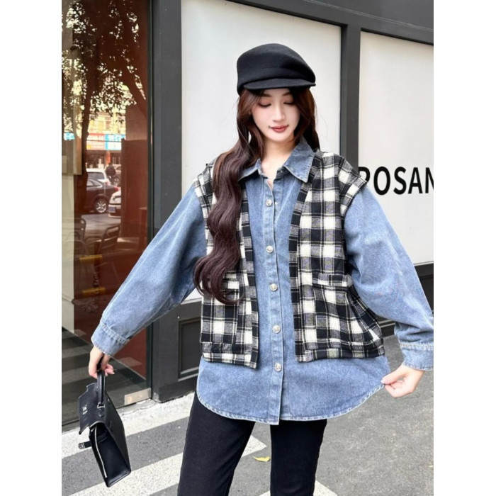 2025春秋新款歐貨牛仔拼條針織假兩件襯衫女新款潮流時尚百搭上衣