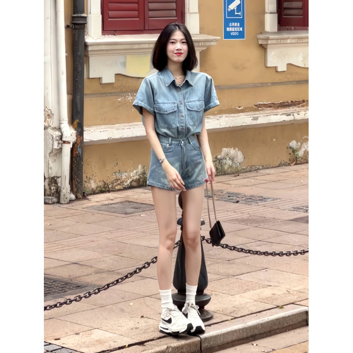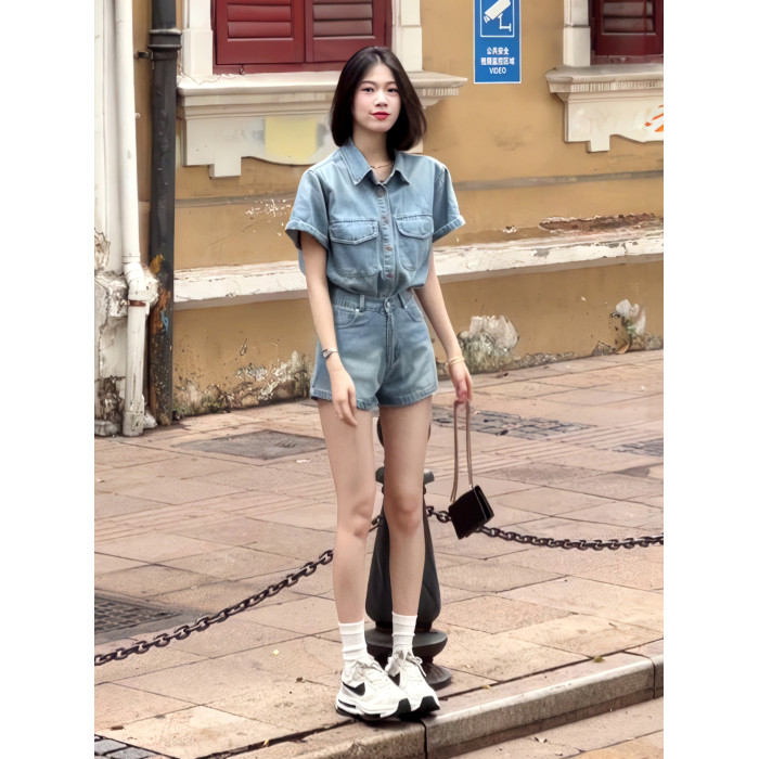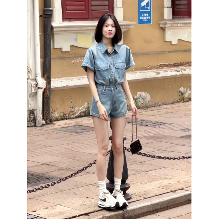 2025夏季時尚一整套氣質翻領短袖牛仔襯衫外套高腰顯瘦短褲兩件套