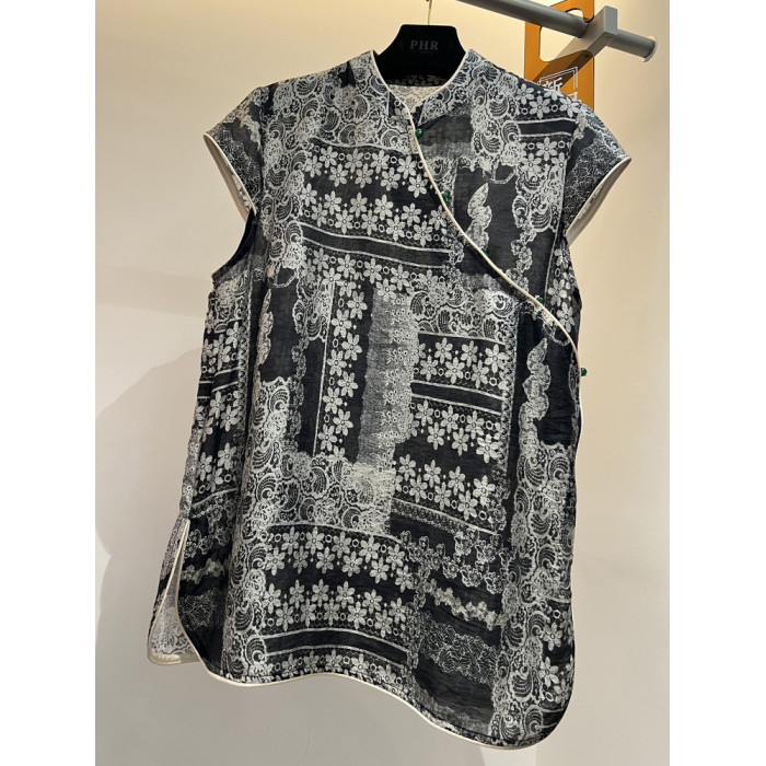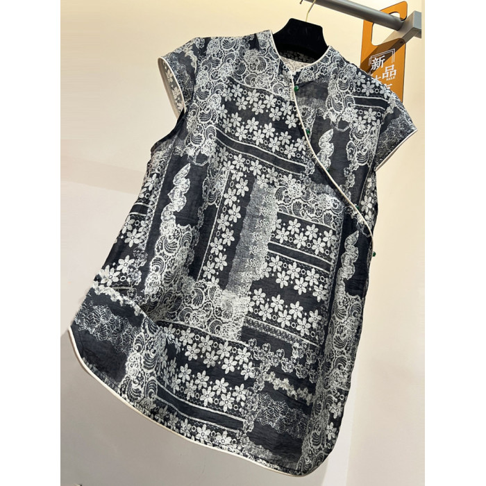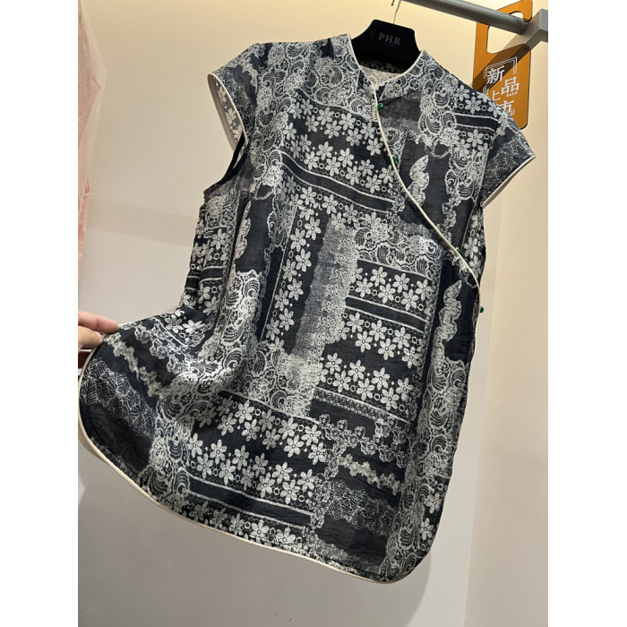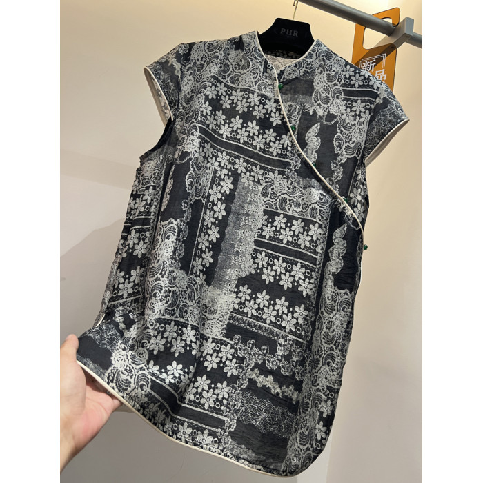 歐貨2025年夏裝新款立領新中式盤釦碎花中長款短袖襯衫國風上衣潮