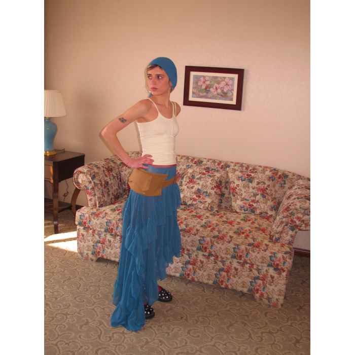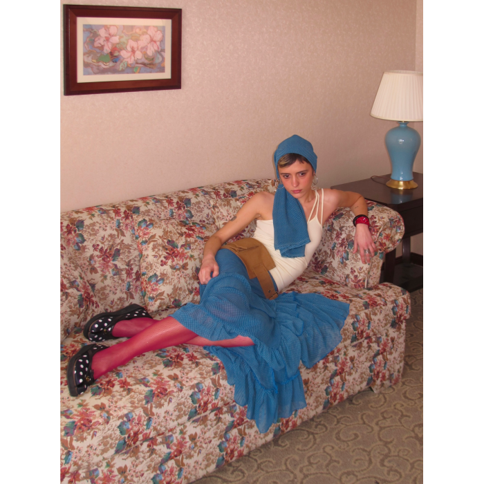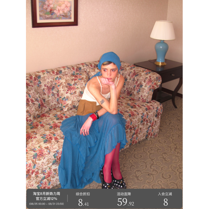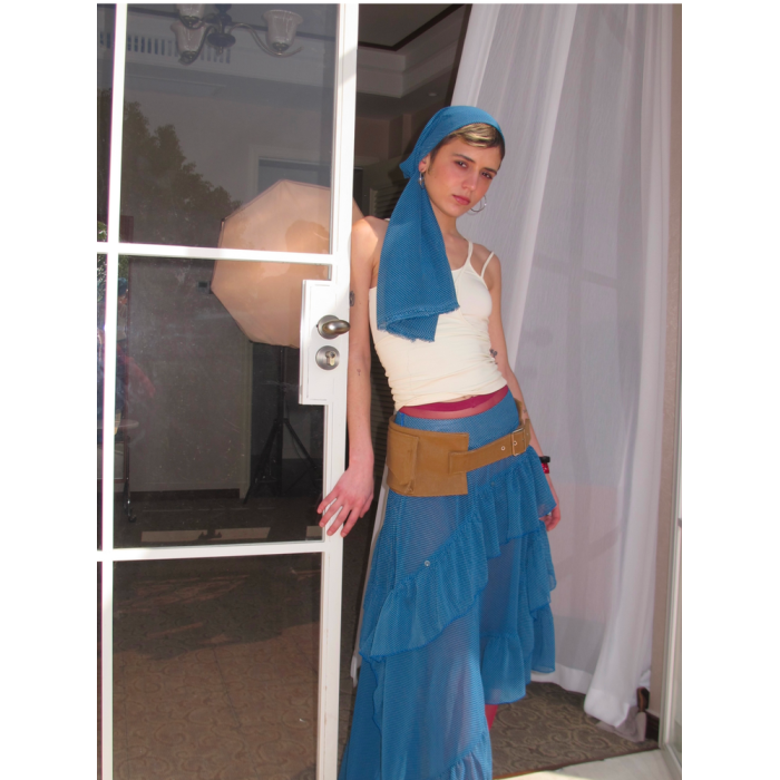 AXIS OF 弗拉明戈 復古藍色不規則長裙子堆褶微透a字網紗半身裙