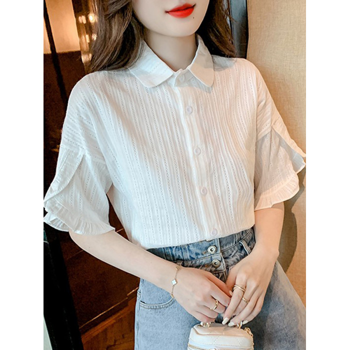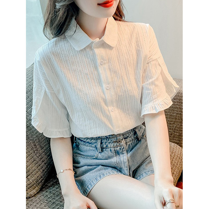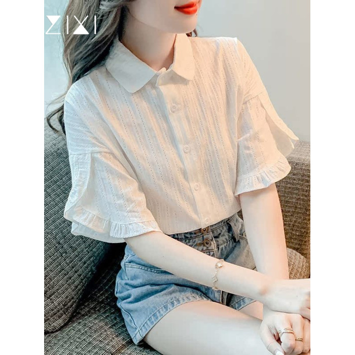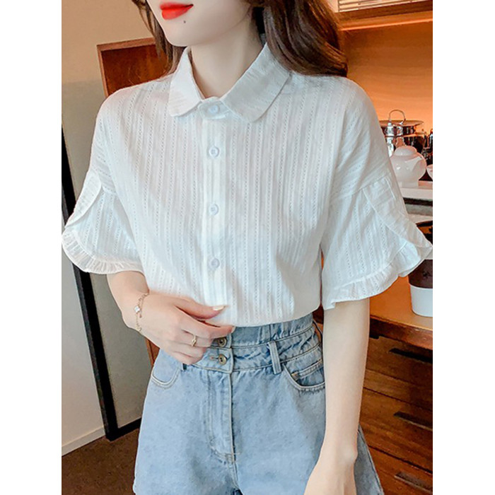 白色短袖襯衫女高級感輕奢荷葉邊上衣2025夏季新款法式喇叭袖襯衣