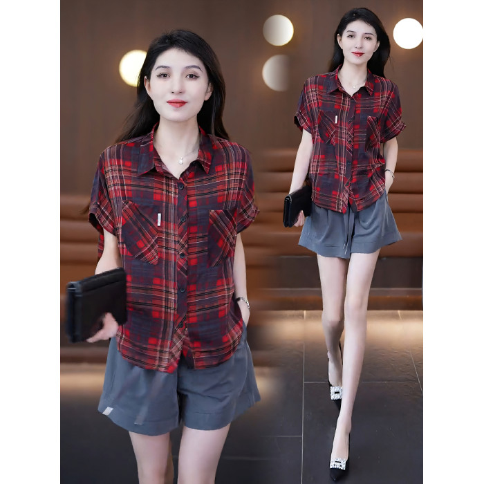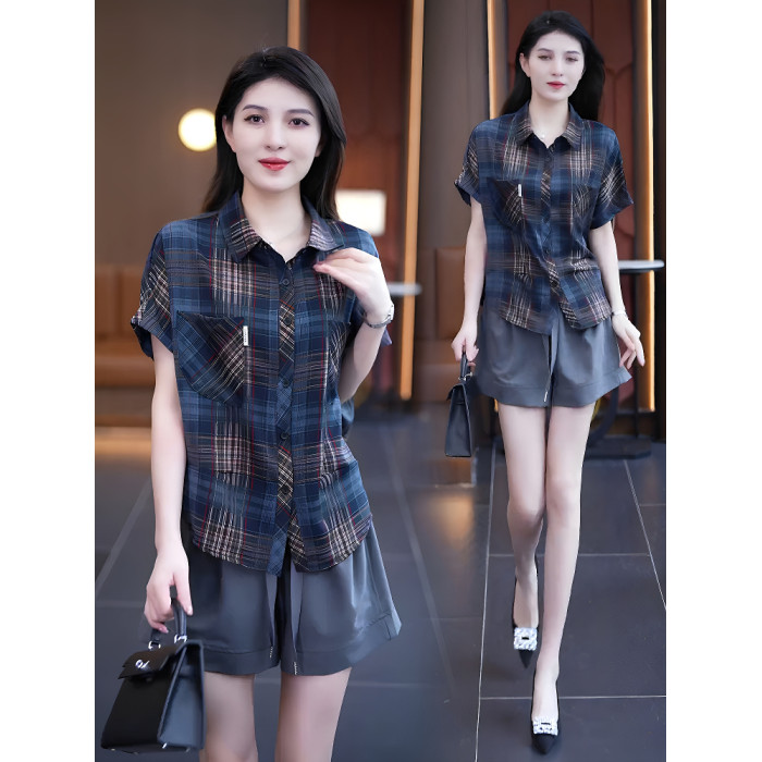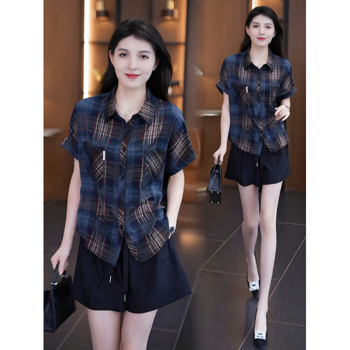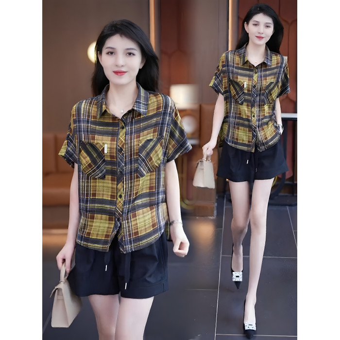 專櫃高定時尚洋氣天絲棉格子襯衫女寬松遮肚子顯瘦短袖百搭上衣潮