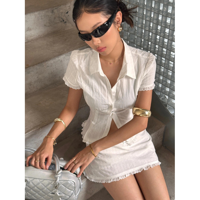 U2家學院風白色短袖襯衫女夏季新款正肩辣妹上衣修身收腰短款襯衣