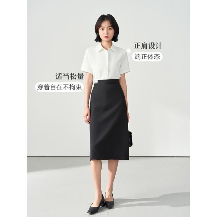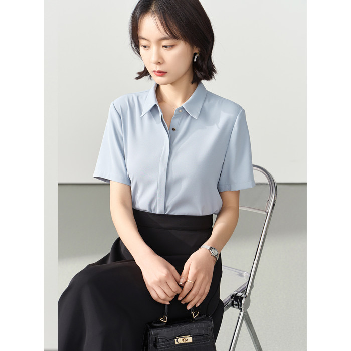 伯德小姐藍色短袖襯衫女裝夏季公考面試正裝職業穿搭正肩雪紡襯衣