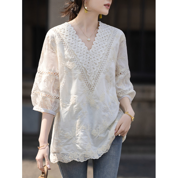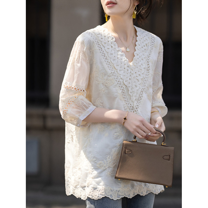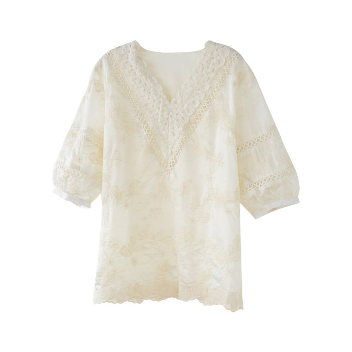 九月墨陌夏季設計感重工拼接v領鏤空襯衫大碼氣質百搭小衫上衣女