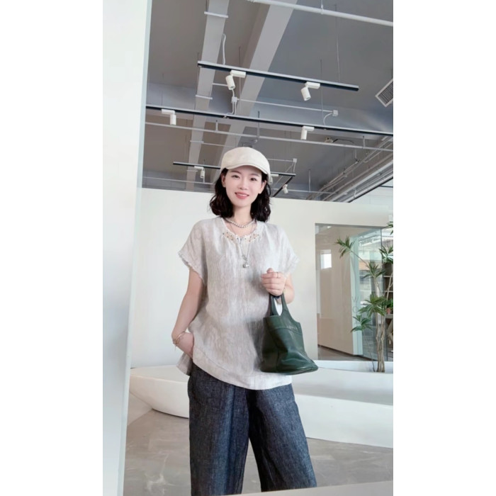 【釘珠小衫】色織雨露麻提花襯衫小包袖釘珠小衫半開襟上衣25195