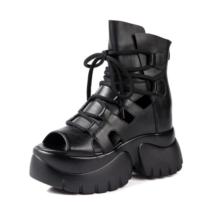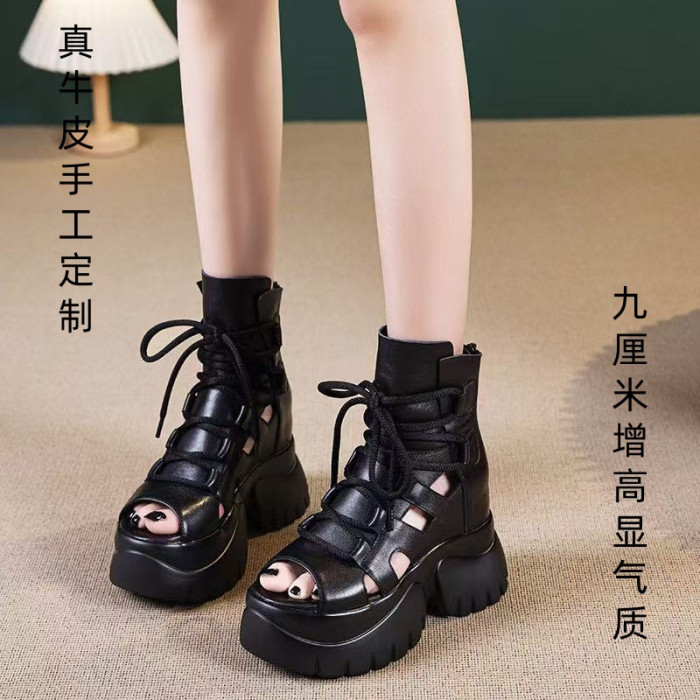 真皮羅馬涼鞋女外穿內增高女鞋2025春夏松糕跟時尚魚嘴厚底涼鞋