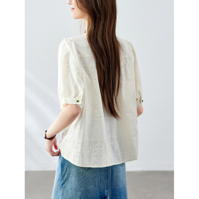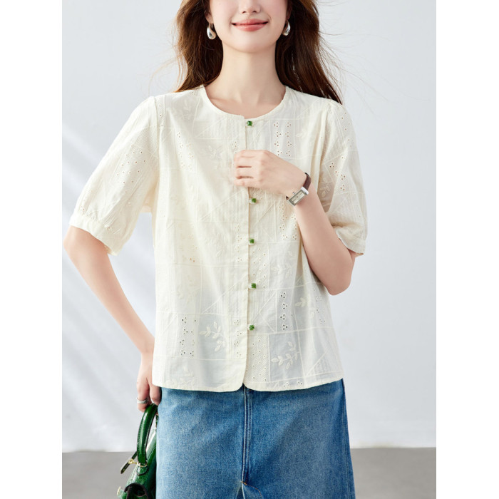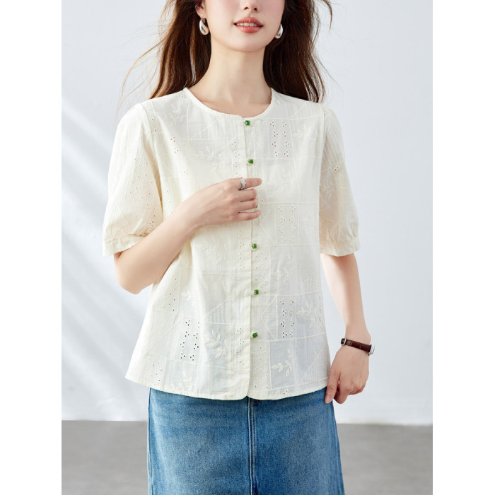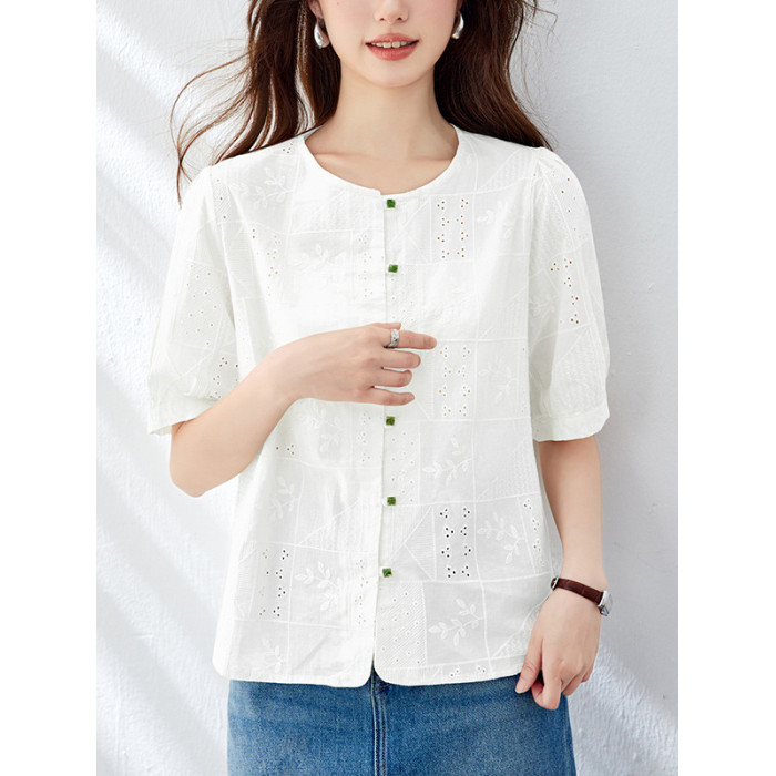 夏季純棉圓領短袖襯衫女刺綉鏤空小衫2025新款洋氣上衣女韓版襯衣