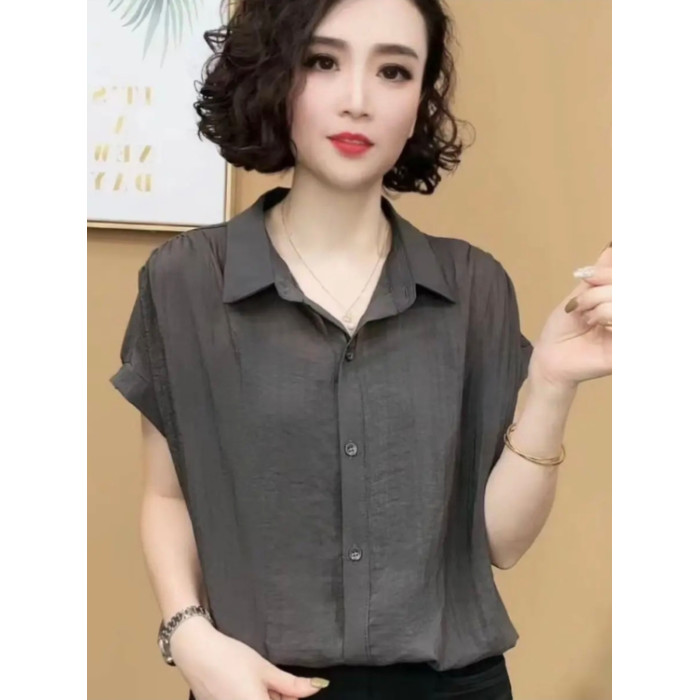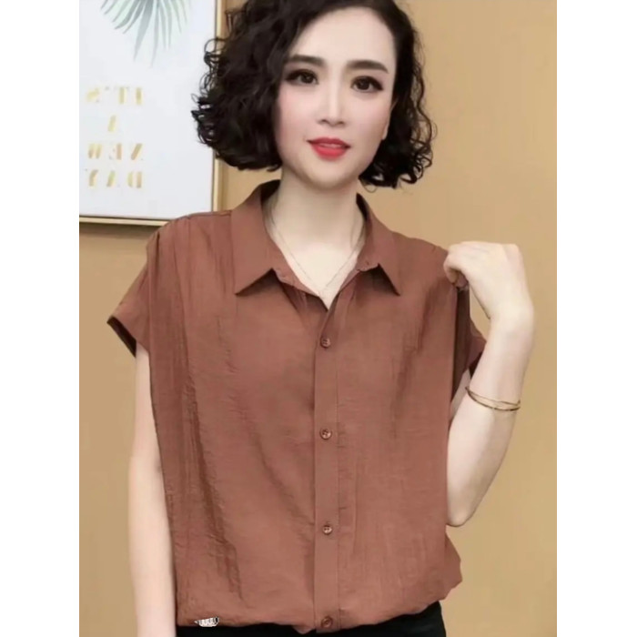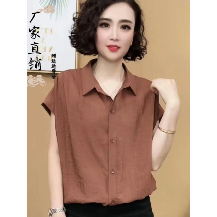 夏季新款寬松透氣薄款短袖襯衫媽媽時尚中年洋氣純色大碼襯衣上衣