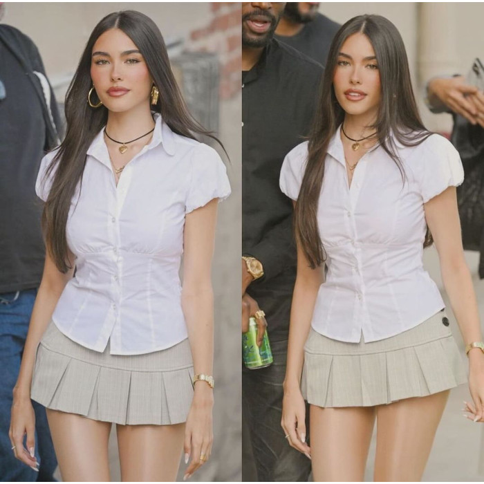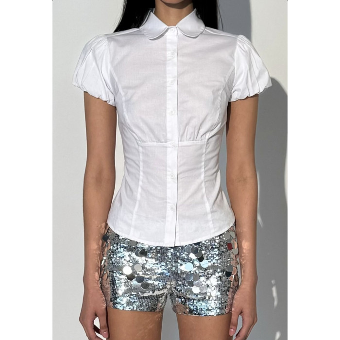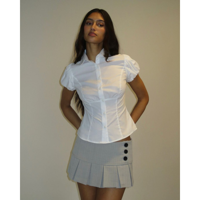 Guizio 白色短袖襯衫 收腰泡泡袖設計 bella啤酒妹同款 復古半裙