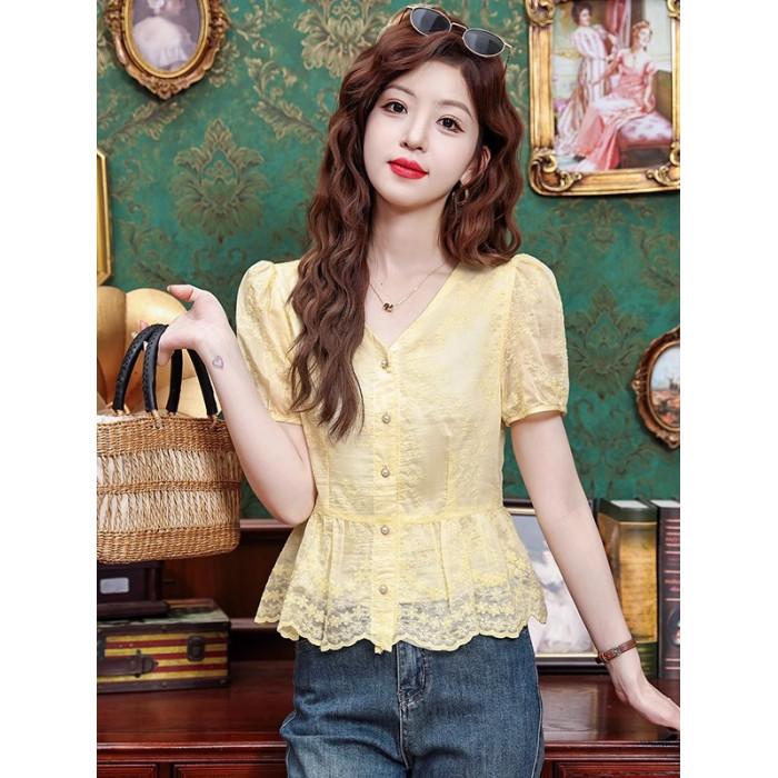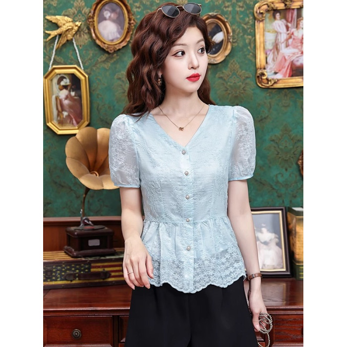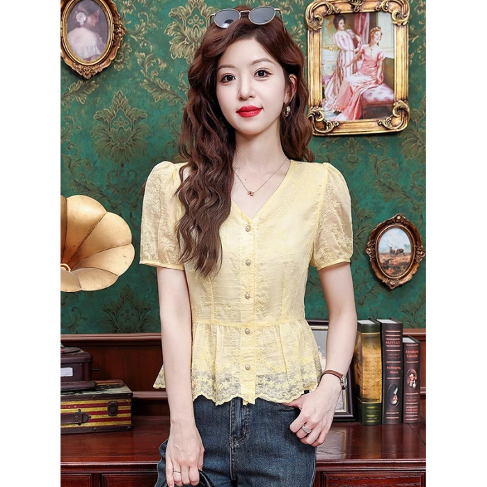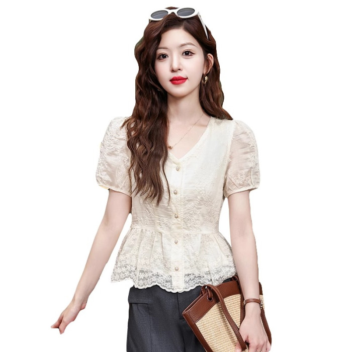 法式小資v領正肩蕾絲短袖襯衫女夏季收腰遮肚顯瘦小衫小個子上衣