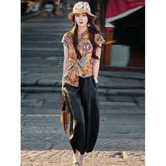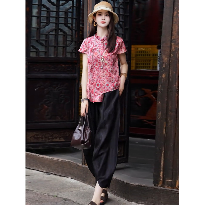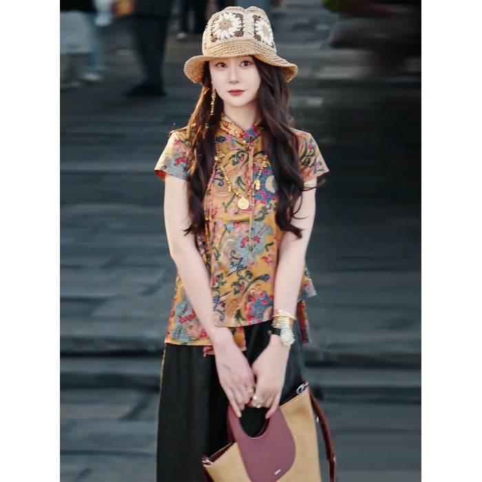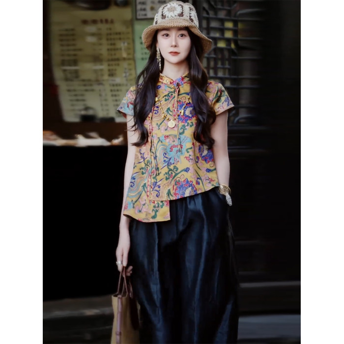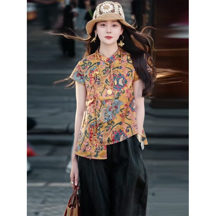 新中式國風旗袍襯衫女2025夏季新款洋氣不規則設計感短袖立領上衣
