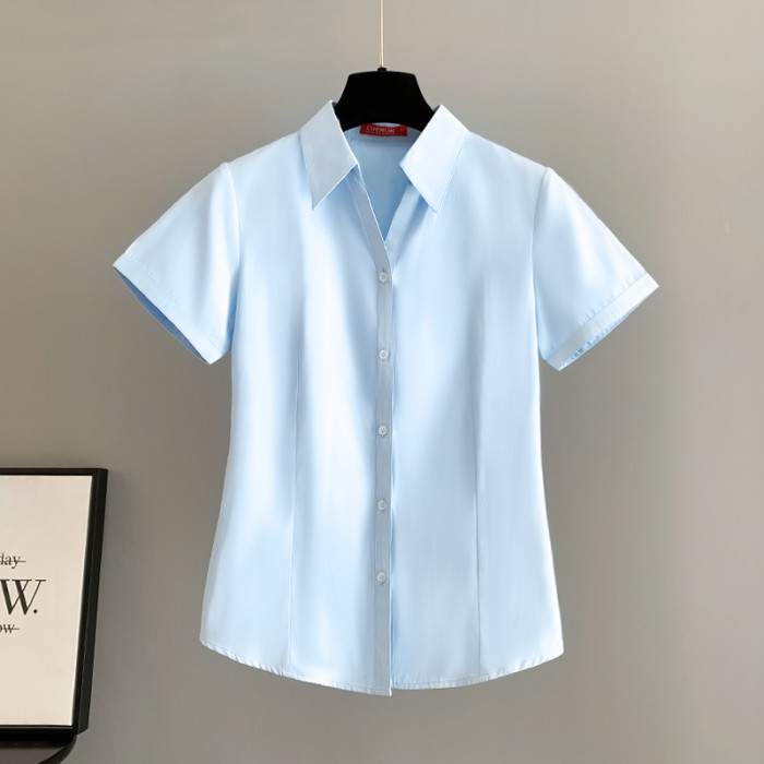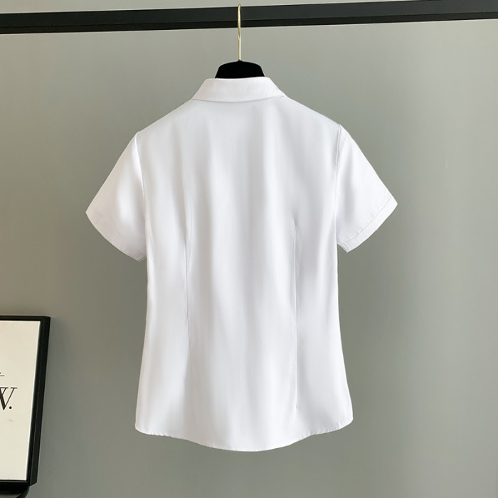 加大碼職業裝女襯衫短袖夏季通勤寬松工裝工作服V領白襯衣200斤