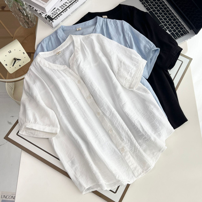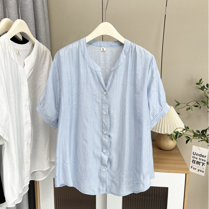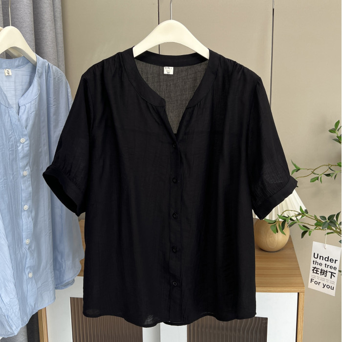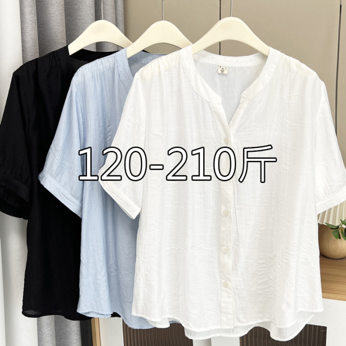 大碼女裝短袖襯衫200斤夏季薄款寬松顯瘦休閒上衣胖MM氣質V領襯衣