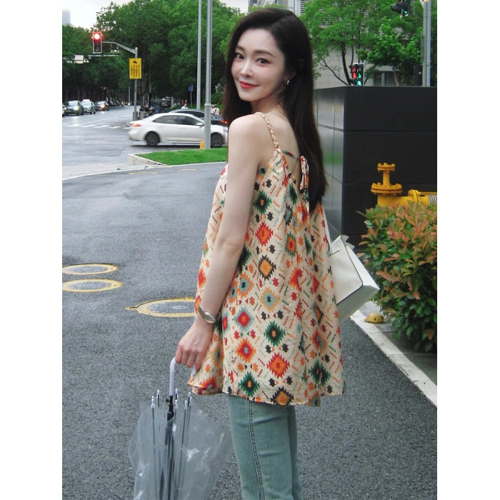 宋軼同款法式波西米亞度假風寬松休閒吊帶背心小衫印花襯衫女夏