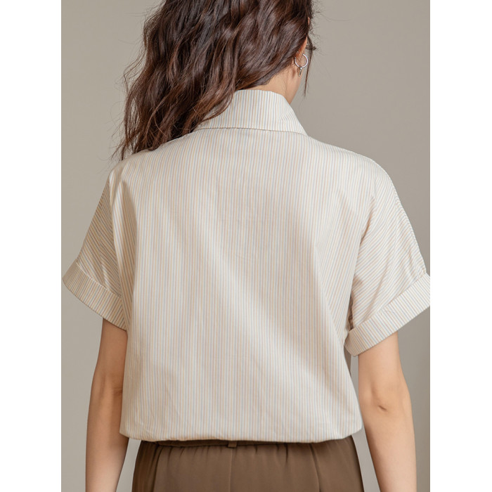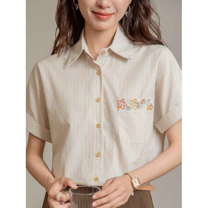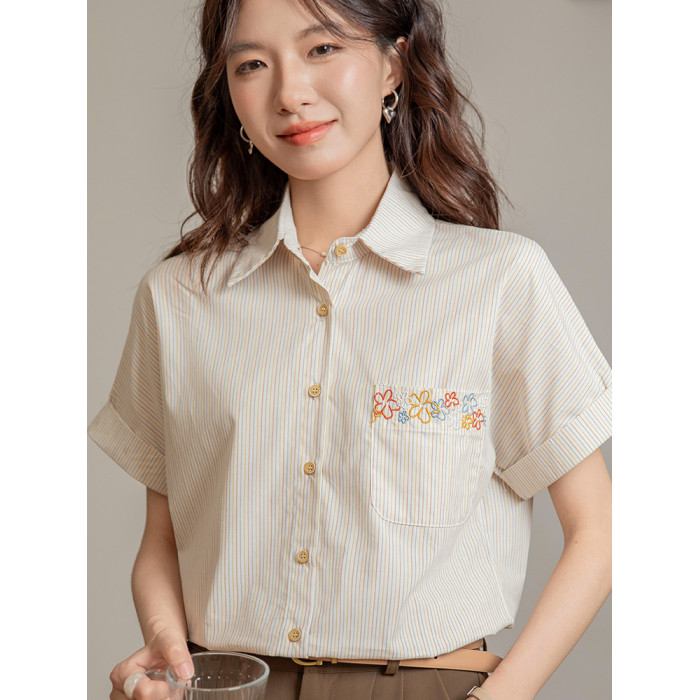 法式設計感小衆純棉綉花條紋短袖襯衫女夏季2025新款休閒通勤上衣