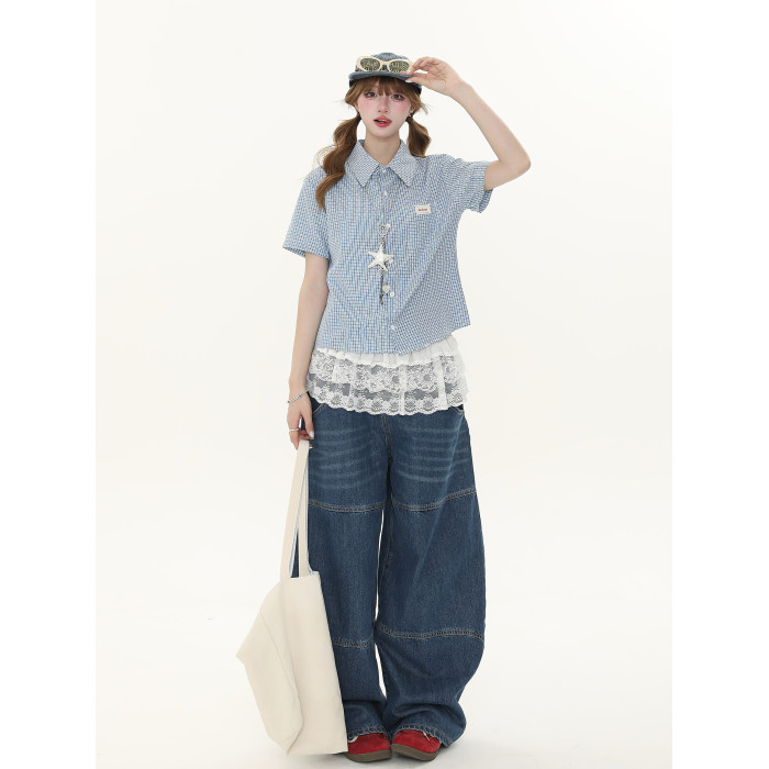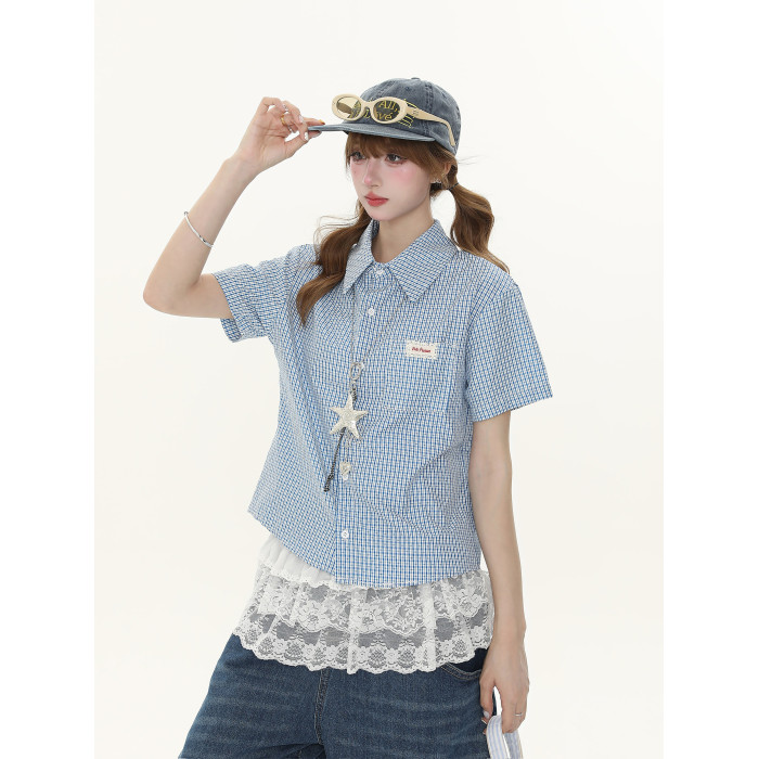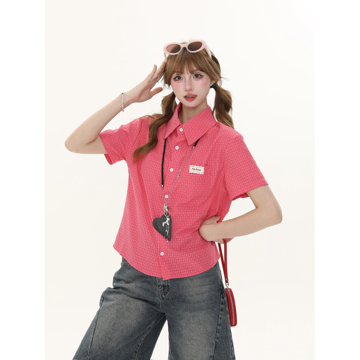 YIKOJIA美式復古格子短袖襯衫女夏季新款寬松顯瘦百搭上衣潮牌