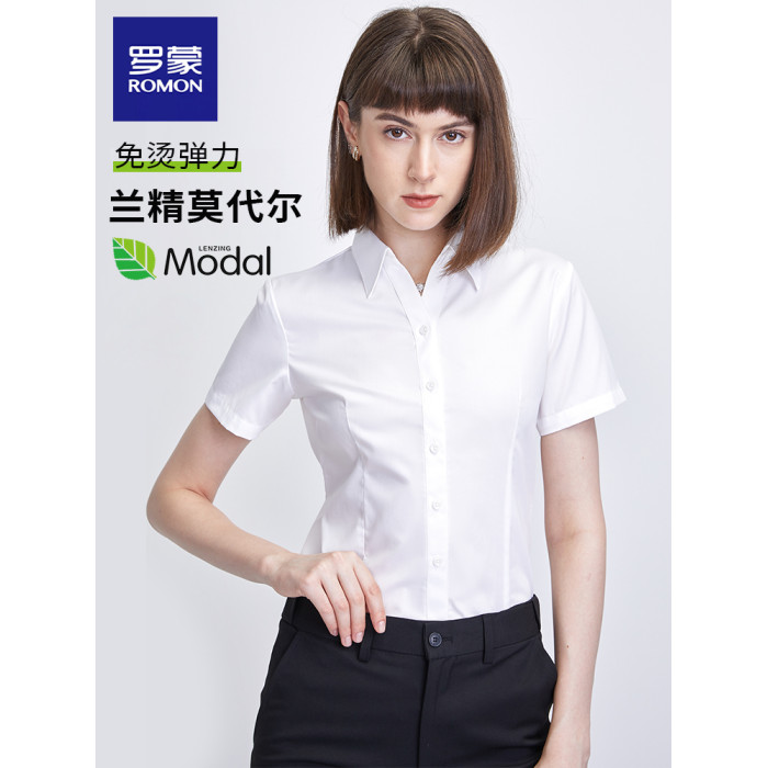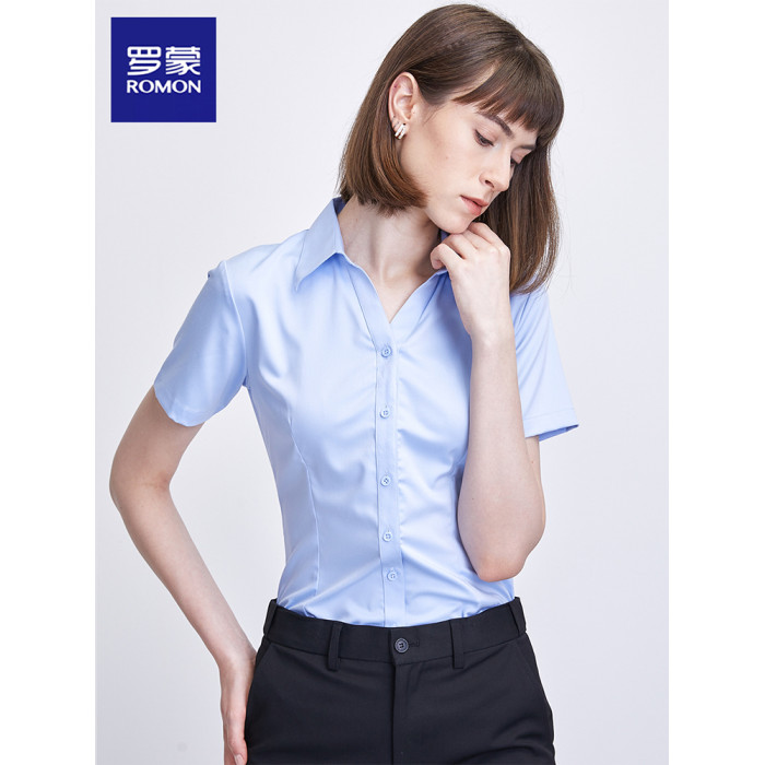 羅矇女士V領短袖白襯衫夏季藍色工裝工作服職業面試襯衣白色上衣