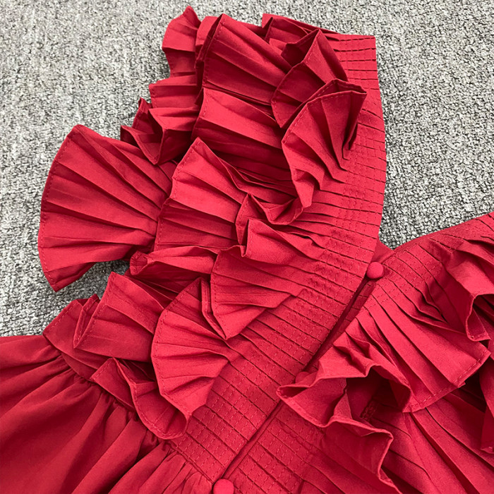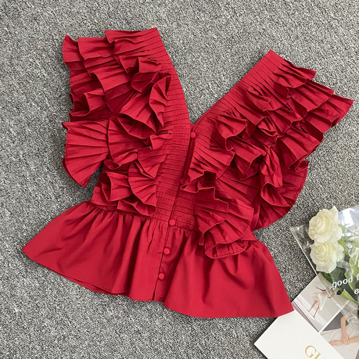 法式炸街單排釦紅色荷葉邊褶皺短款襯衫女夏重工小衆洋氣無袖上衣