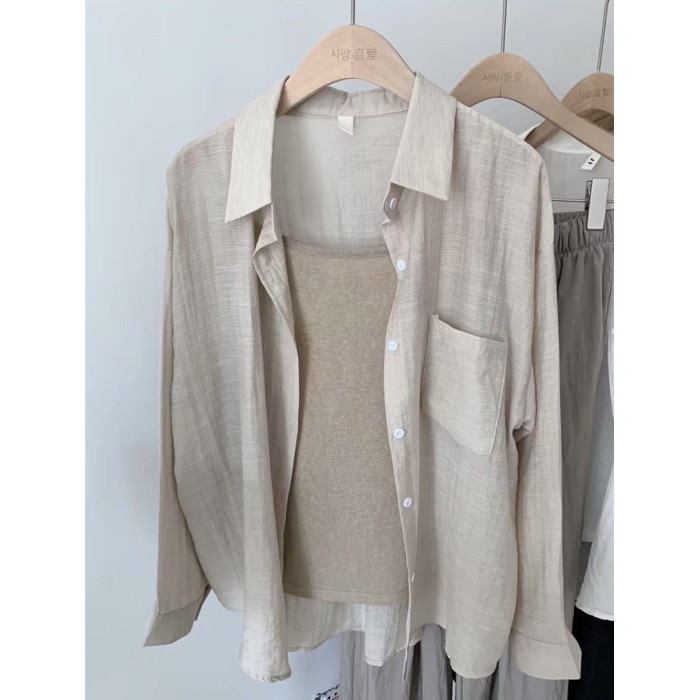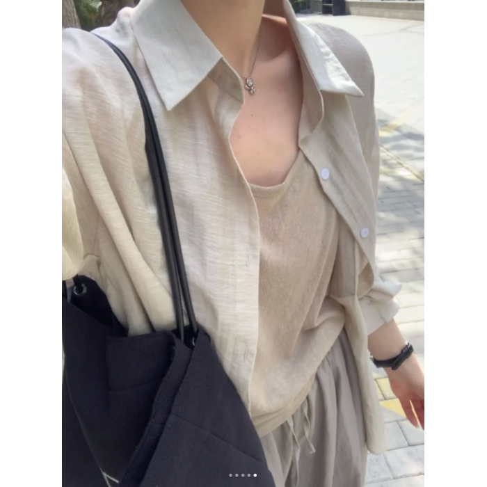夏季簡單慵懶感舒服天絲竹節棉麻卡其色防曬襯衫吊帶兩件套上衣女