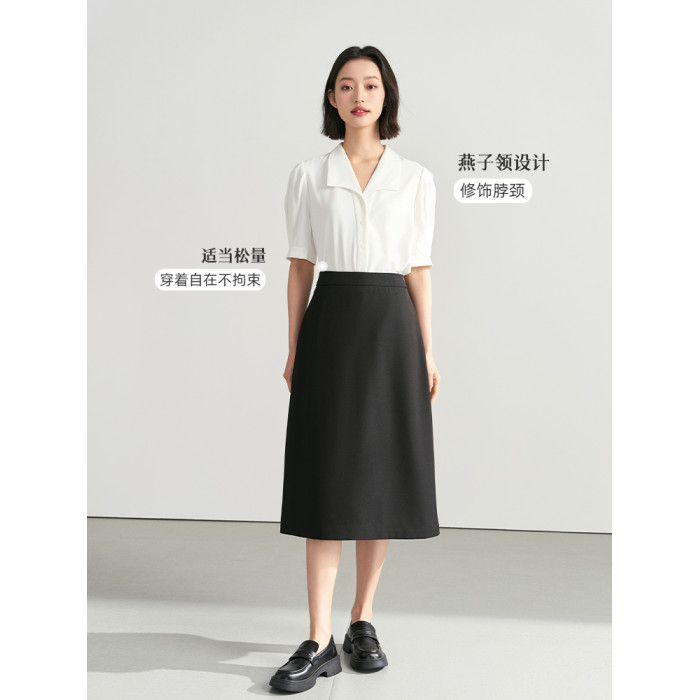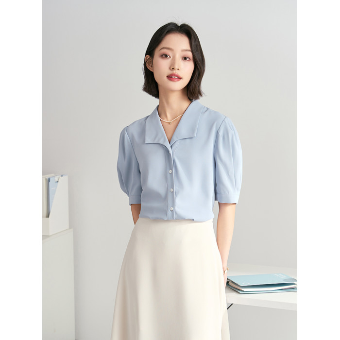 伯德小姐藍色短袖雪紡襯衫女士夏季通勤穿搭面試上衣職業正裝襯衣