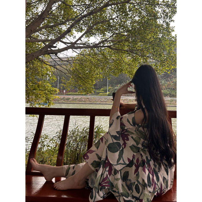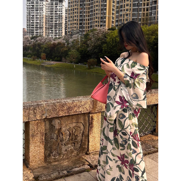 ROUJE KORE法式輕奢法式植物花卉印花棉麻復古碎花一字肩長袖襯衫