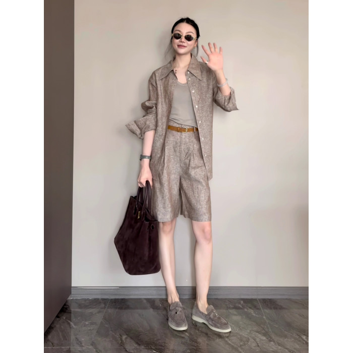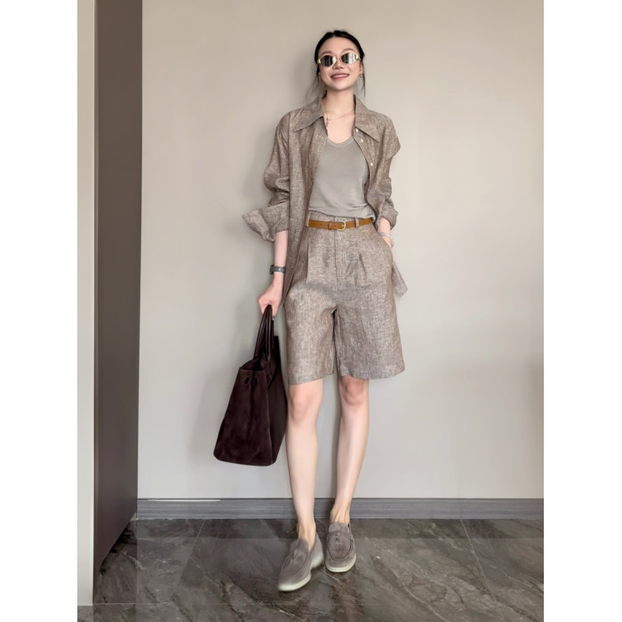 老錢風又酷又颯的穿搭小個子通勤卡其亞麻防曬襯衫短褲套裝女夏季