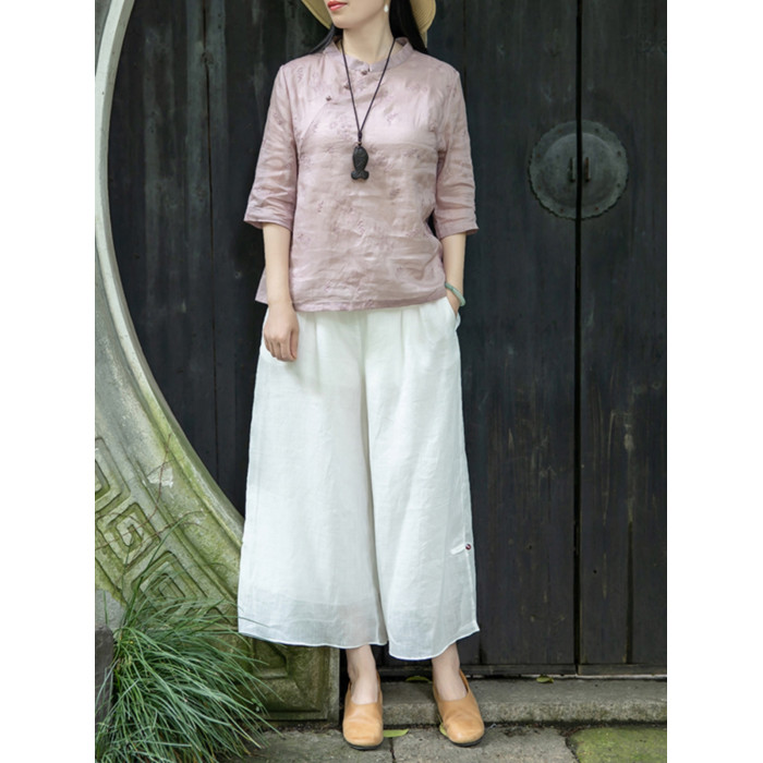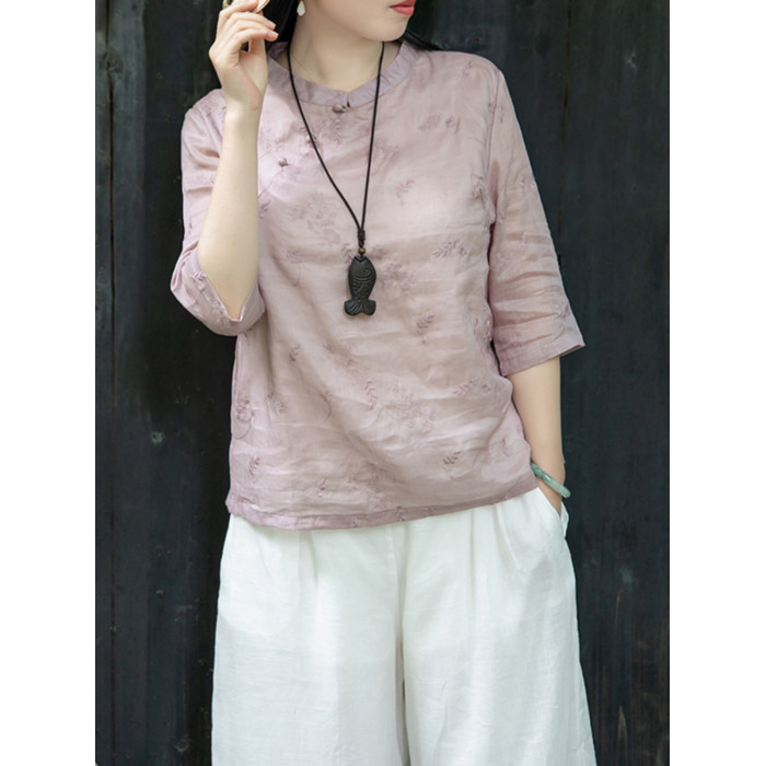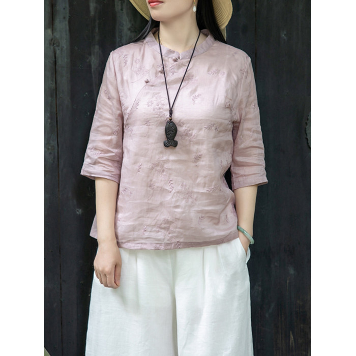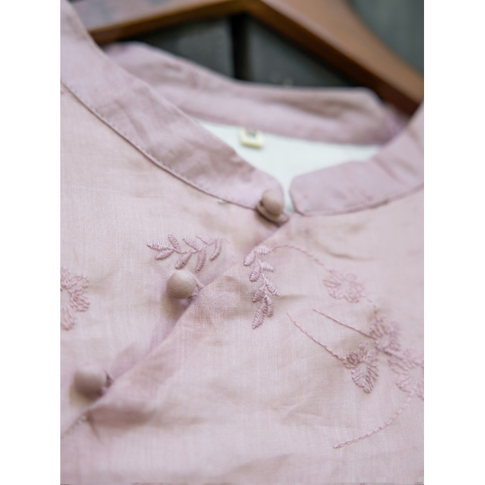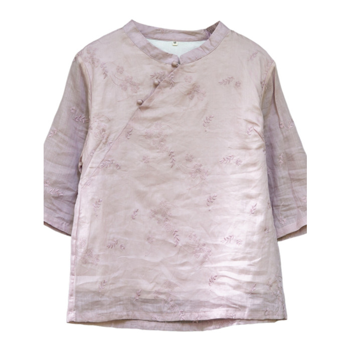 念江南新中式改良立領斜襟苧麻刺綉襯衫小衆設計感女中袖氣質上衣