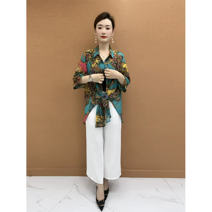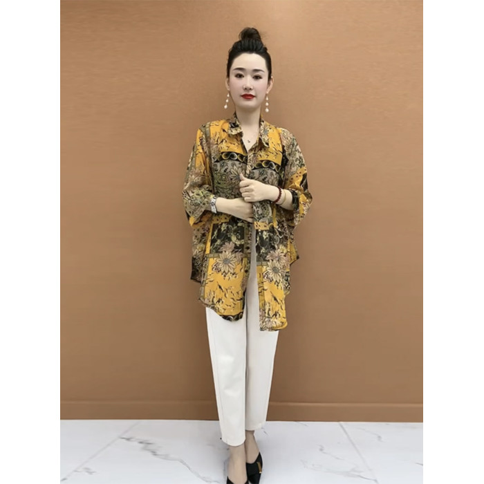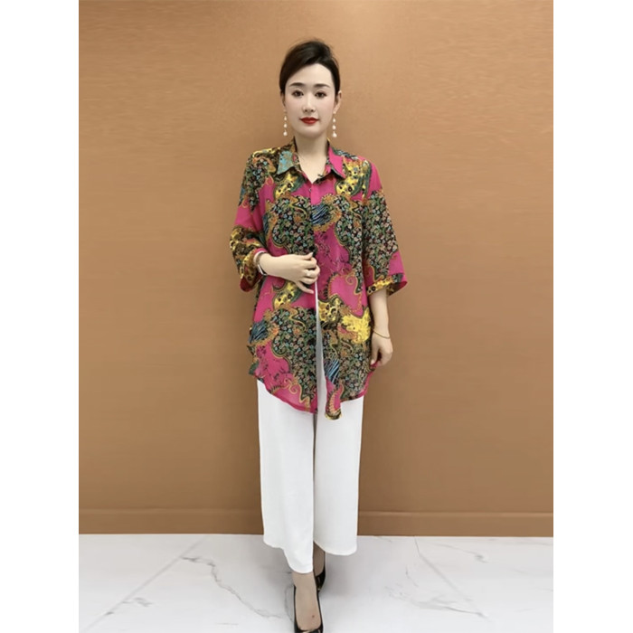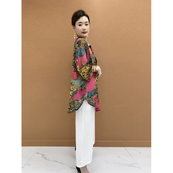 夏季中長款花色翻領防曬襯衫雪紡開衫上衣洋氣寬松大碼老年人襯衣