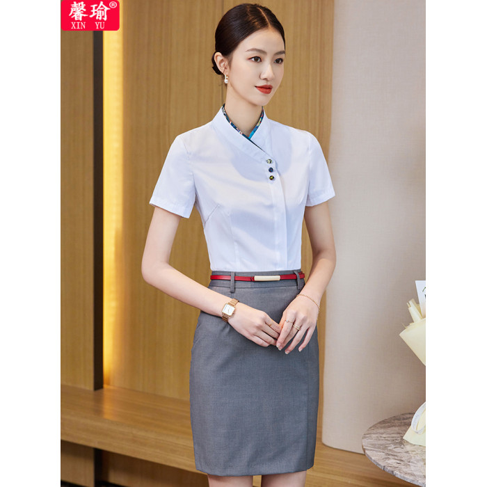 夏季酒店前台職業裝襯衫女空姐氣質短袖餐飲收銀服務員工作服套裝