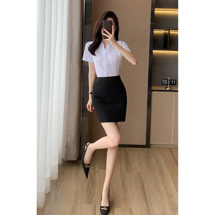 空乘職業套裝襯衫女職業裝氣質V領白色空姐製服套裙女春季工作服