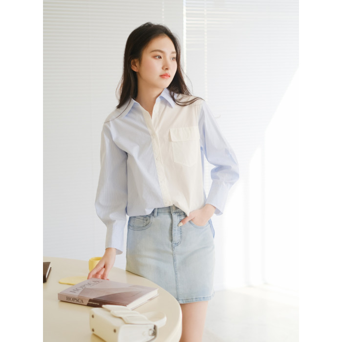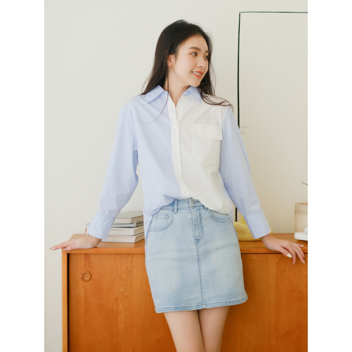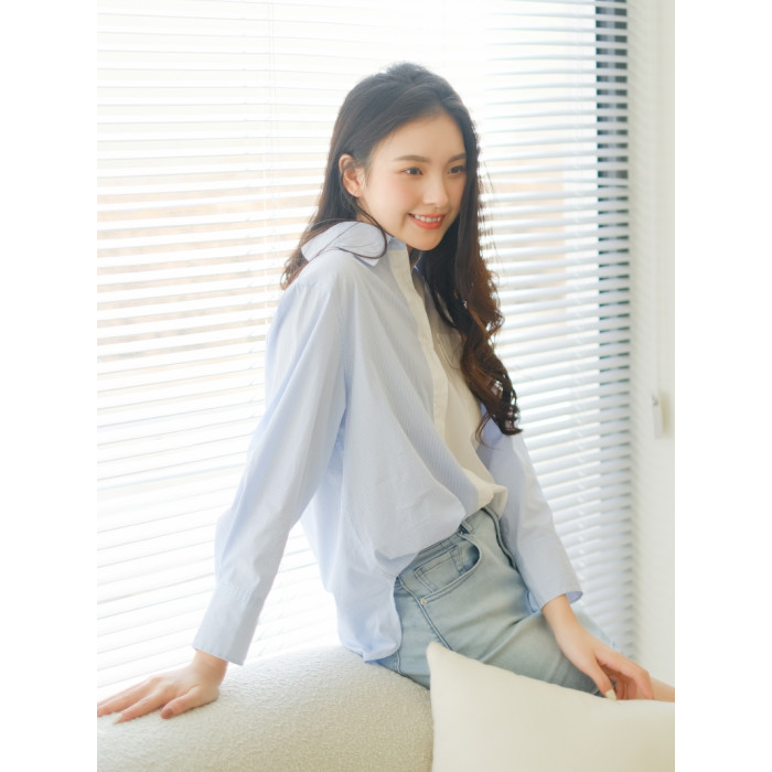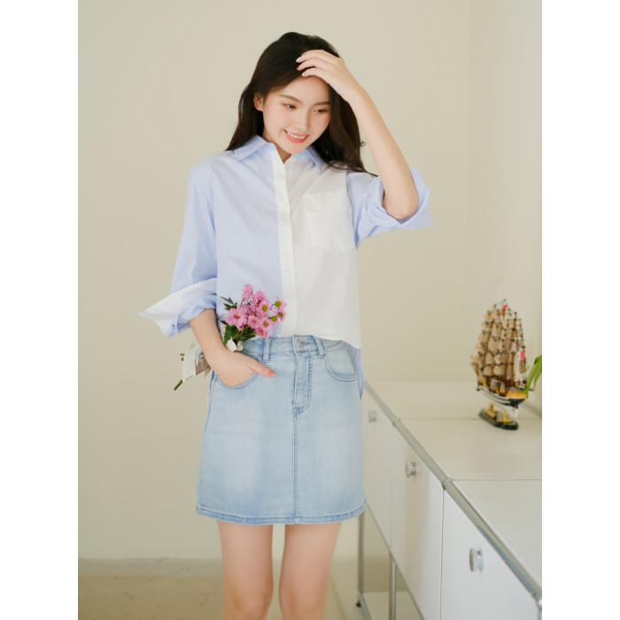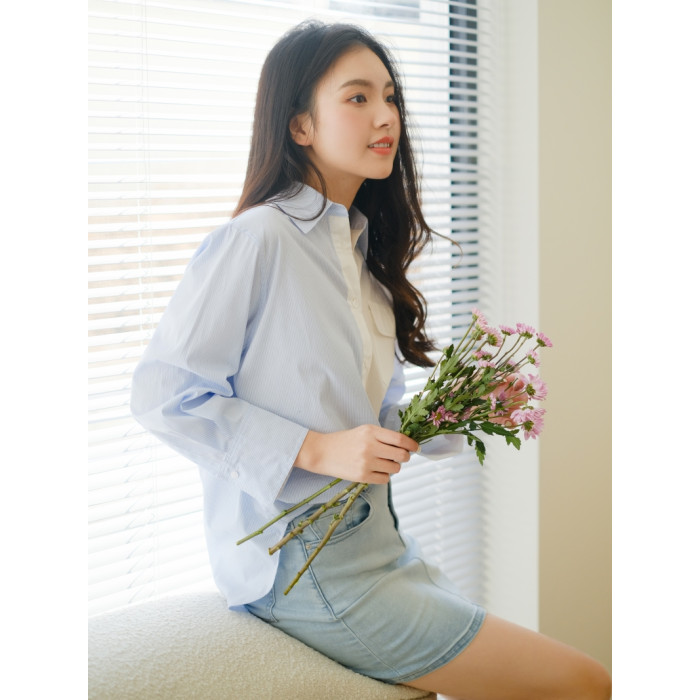 小確幸 天絲棉藍色條紋襯衫拼接百搭休閒七分袖襯衣