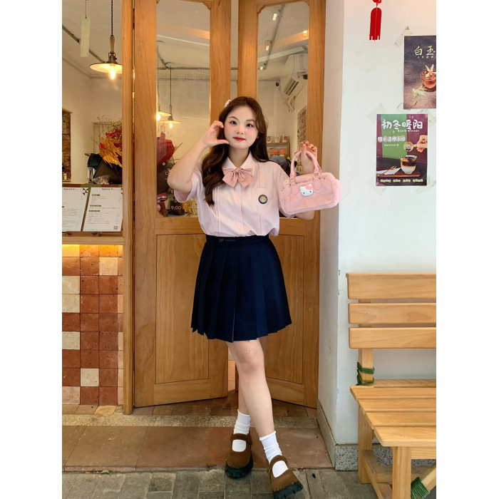 粉色短袖襯衫+紺色裙48長度