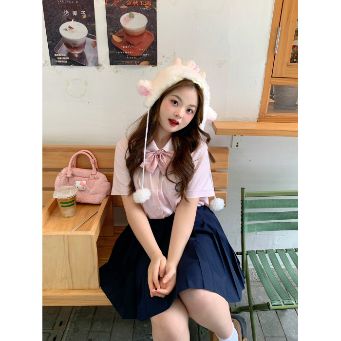粉色短袖襯衫+紺色裙55長度