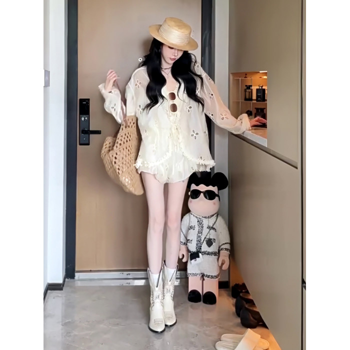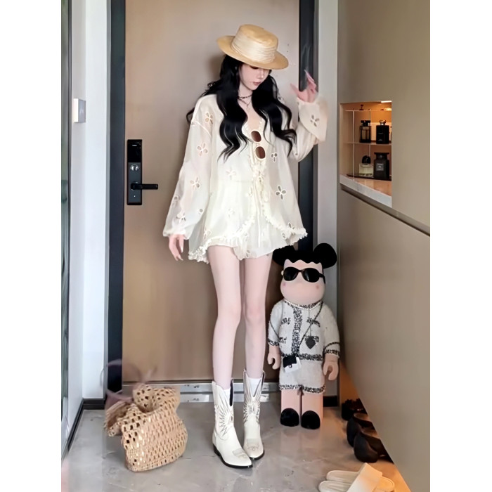 2025夏款【夢谿洛花】甜美V領花邊鏤空花朵寬松襯衫+高腰短褲套裝