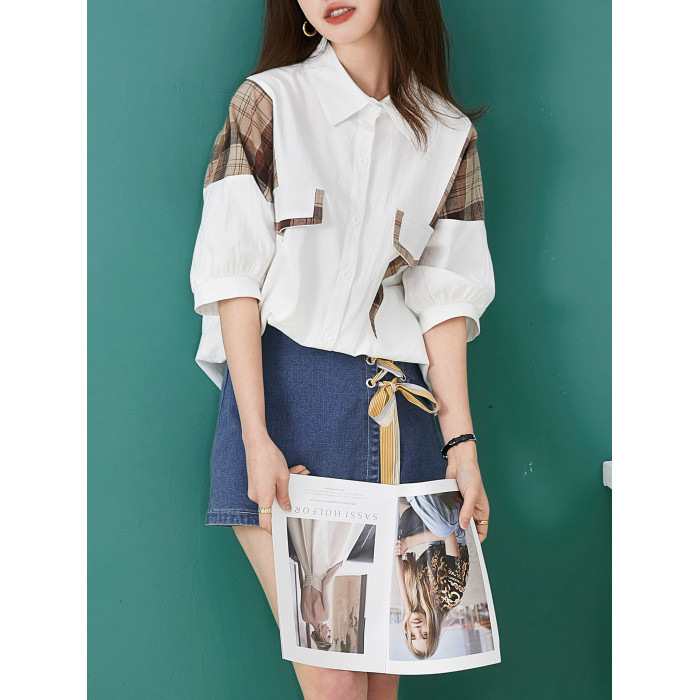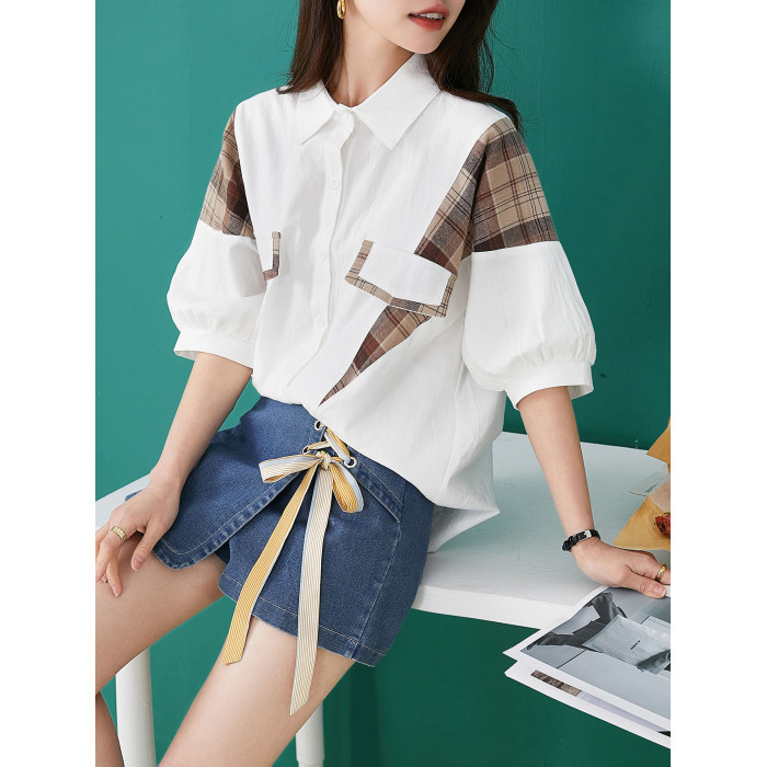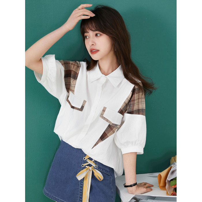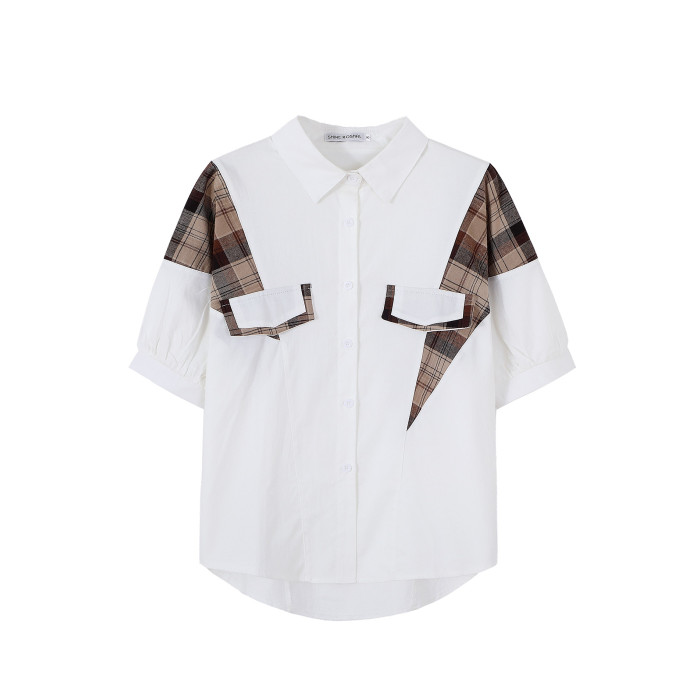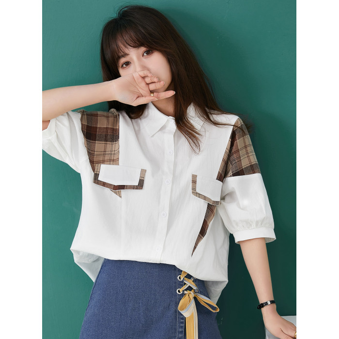 夏季設計感小衆棉襯衣短袖百搭簡約寬松顯瘦格子襯衫別致上衣女