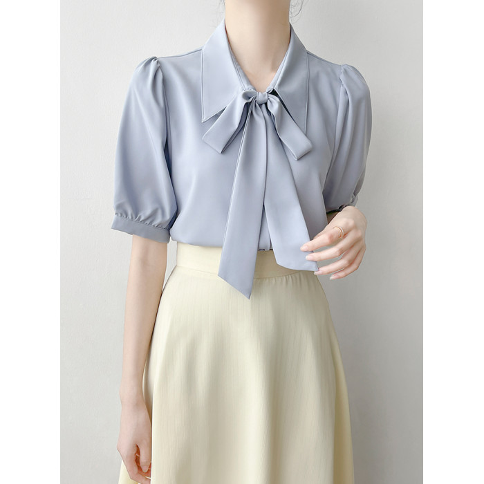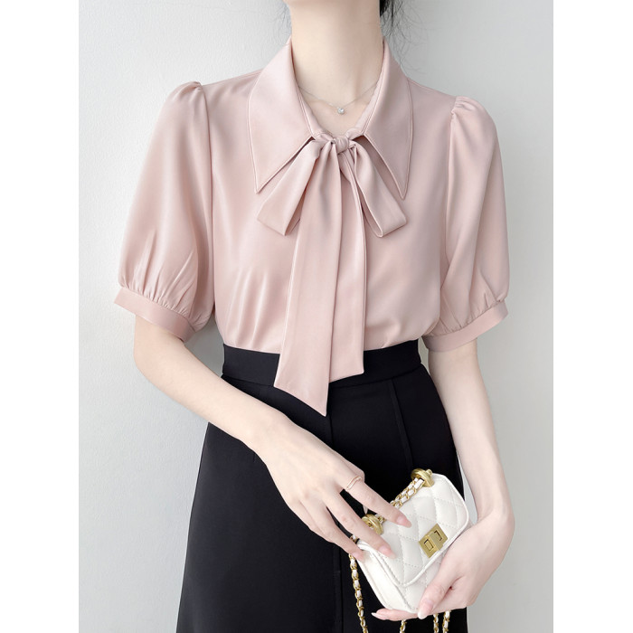 韓帛雅粉色雪紡短袖襯衫女夏季職業面試ol通勤氣質蝴蝶結飄帶上衣