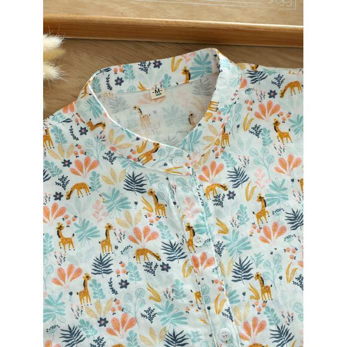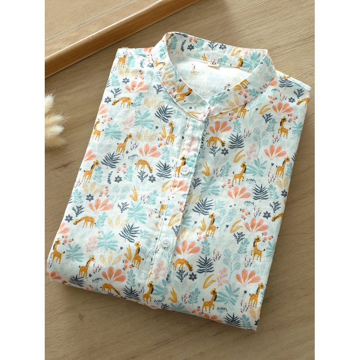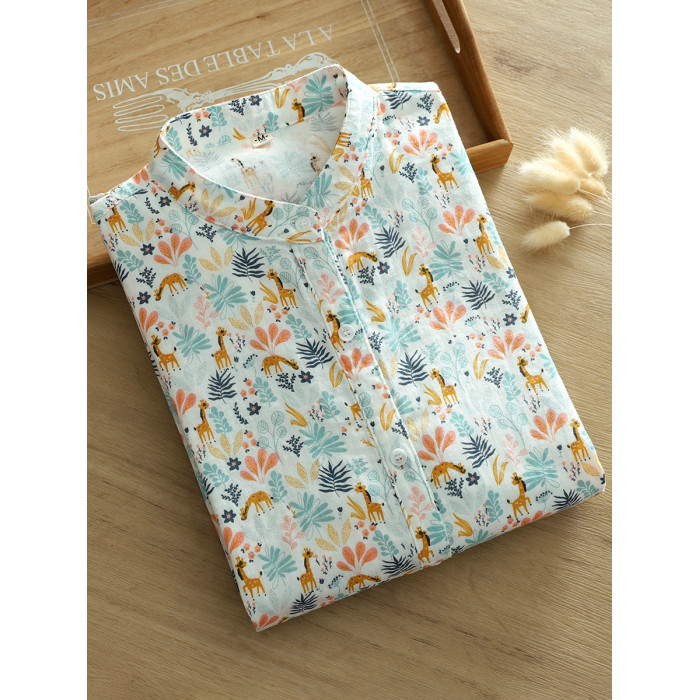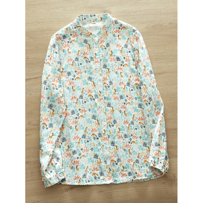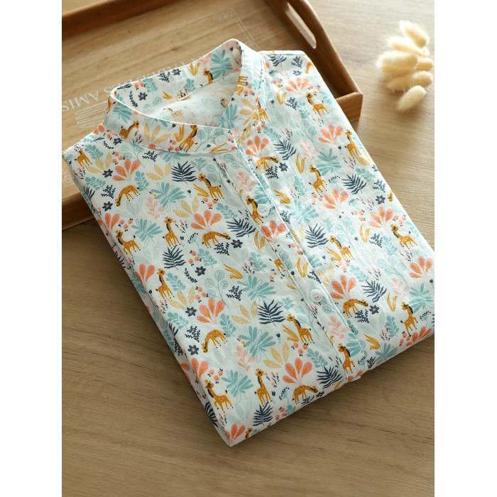 雙層棉紗長袖襯衫女文藝清新印花小立領柔軟親膚透氣純棉打底上衣