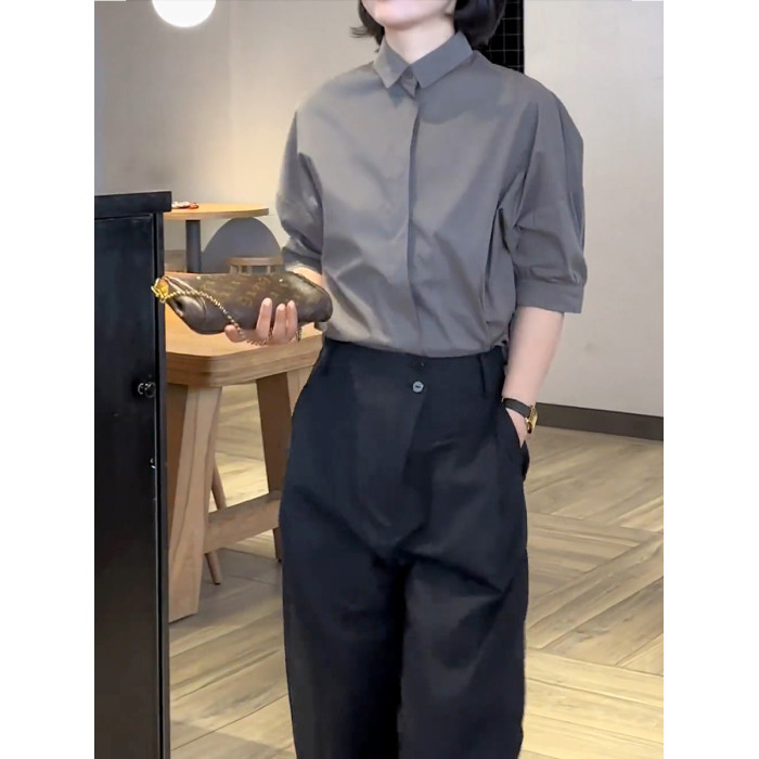 POLO領短袖襯衫女夏季2025新款設計感小衆輕熟風九分休閒褲兩件套