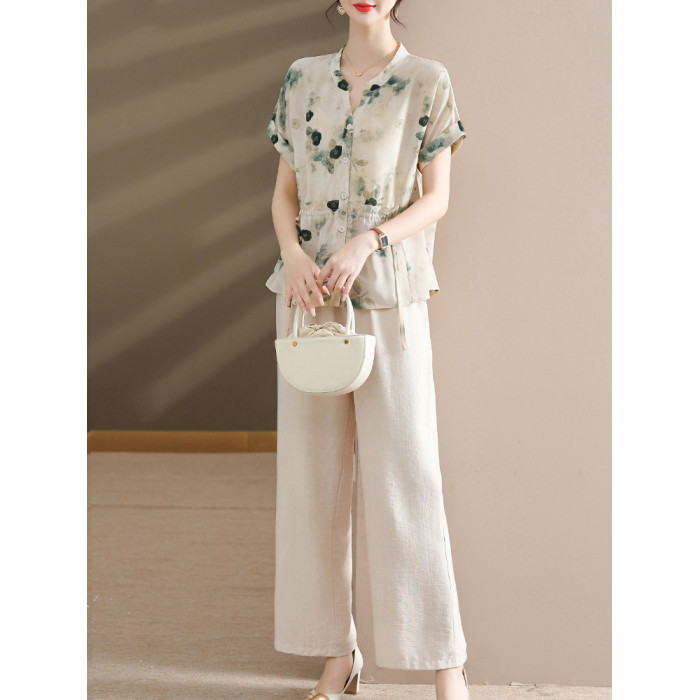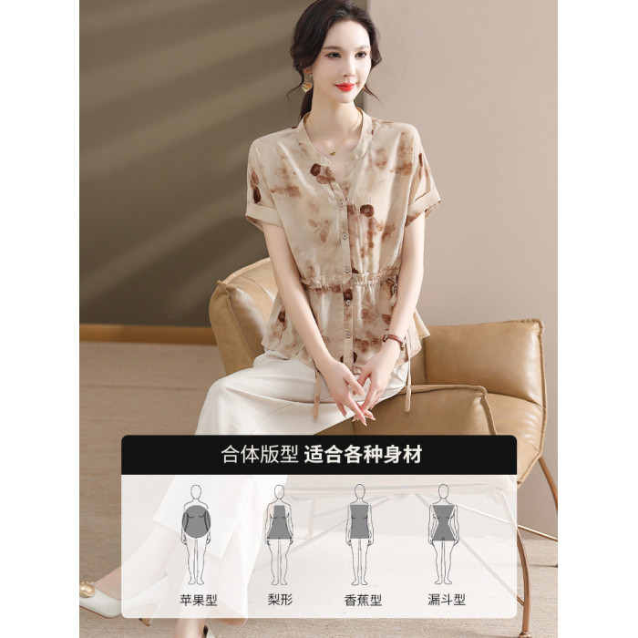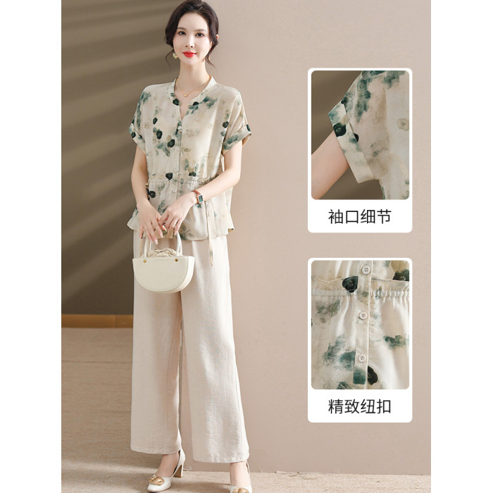 2025新款中年媽媽夏裝套裝雪紡小衫中老年女裝短袖襯衫兩件套