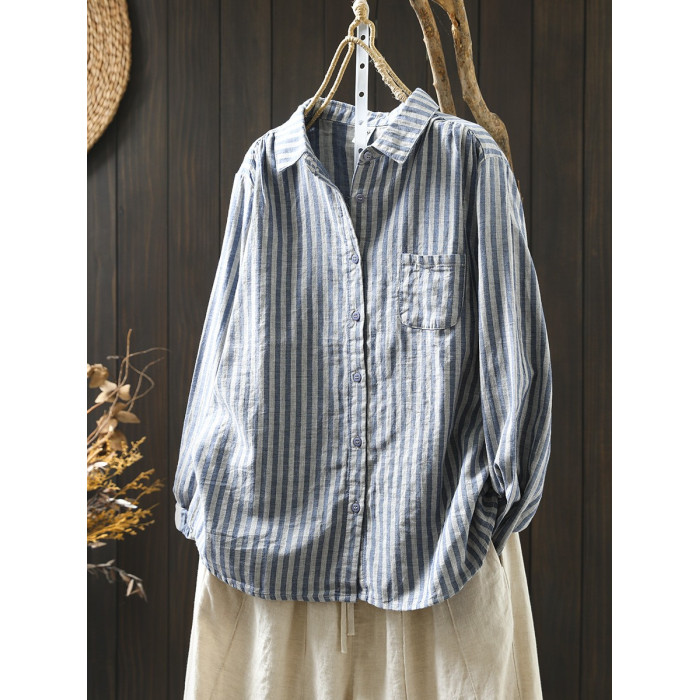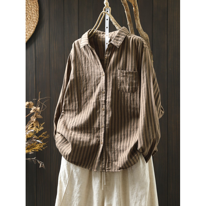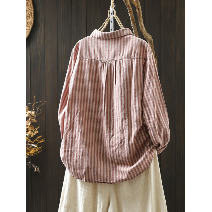 雙層棉紗純棉粉色條紋襯衫女長袖2025新款秋季寬松休閒遮肉上衣