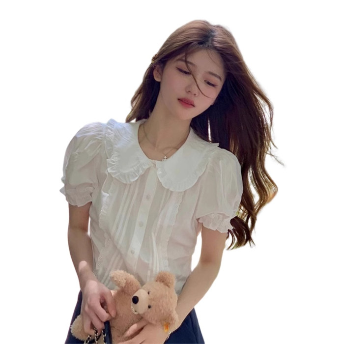 白色泡泡袖短袖襯衫女夏季新款娃娃領法式荷葉邊襯衣修身短款上衣