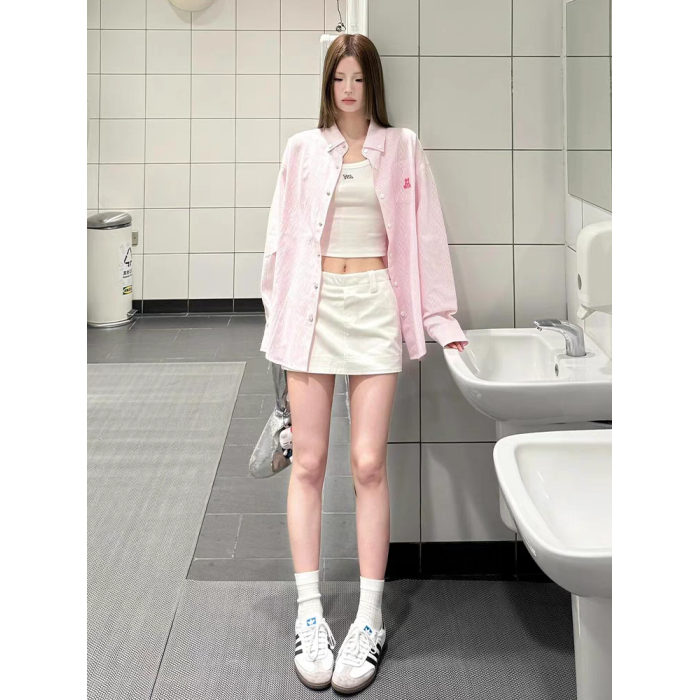 美式復古襯衫女春季小狗刺綉粉色條紋襯衣寬松防曬外套多巴胺上衣