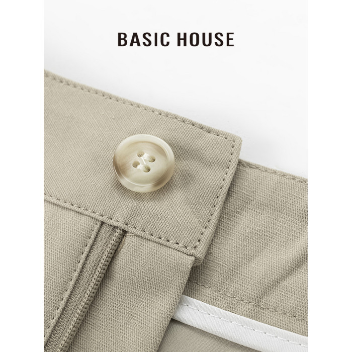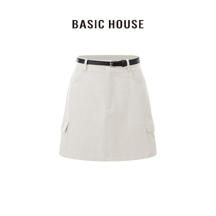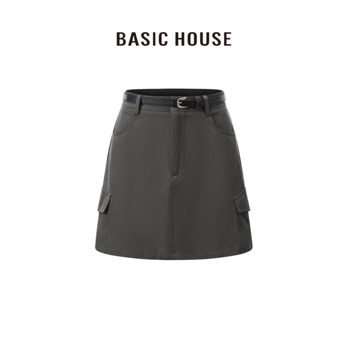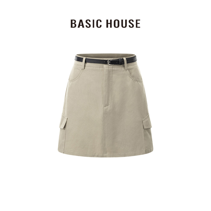 百家好/Basic House高腰立體口袋工裝短裙女腰帶通勤直筒包臀裙夏