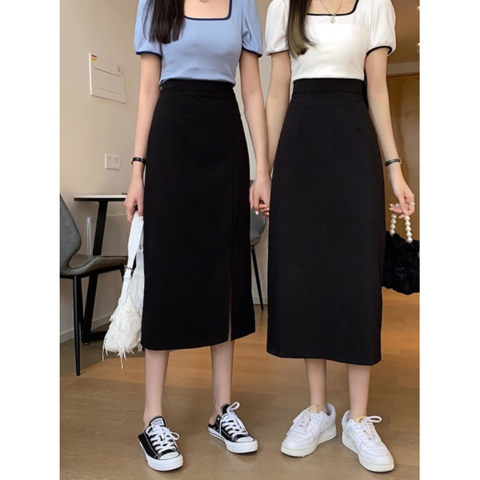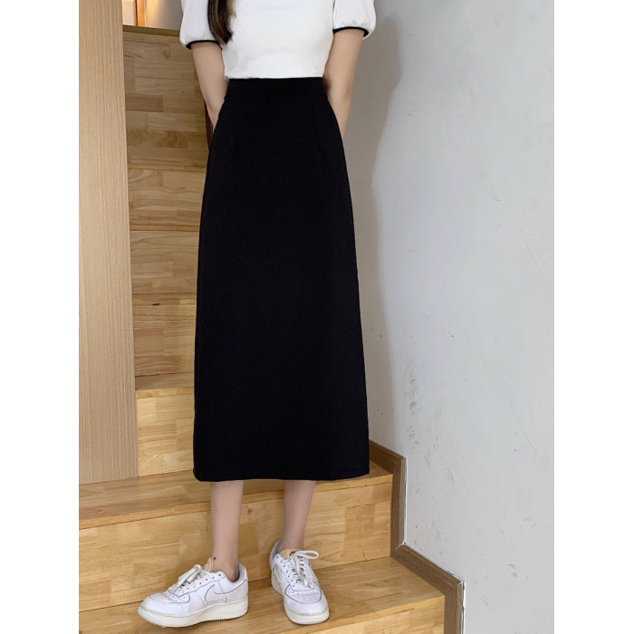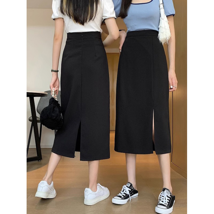 梨形身材黑色西裝半身裙女春夏大碼胖mm高腰顯瘦中長款開叉a字裙